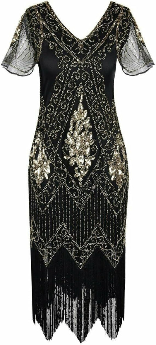 866 - Plus Size 1920s Vintage Fringed Gatsby Sequin Beaded Tassels Hem Flapper Party Prom Cocktail Concert Dress