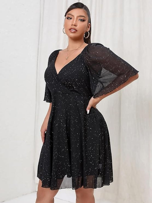 828 - Plus Size Long Sleeves Wrapped V Neck Sequins Skater Style Cocktail Evening Club Dress